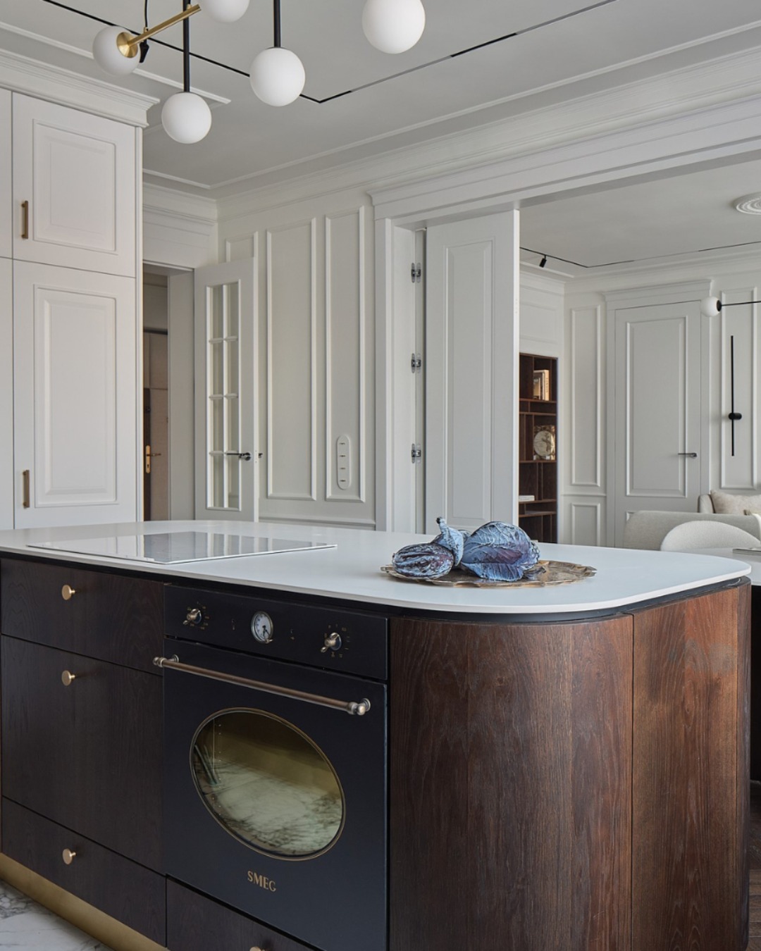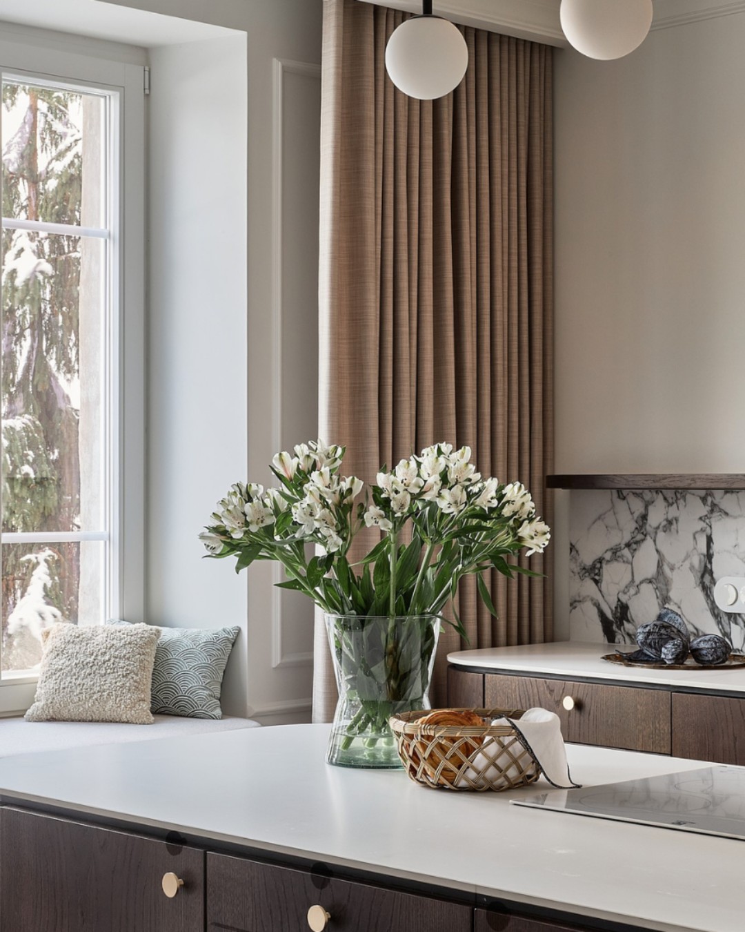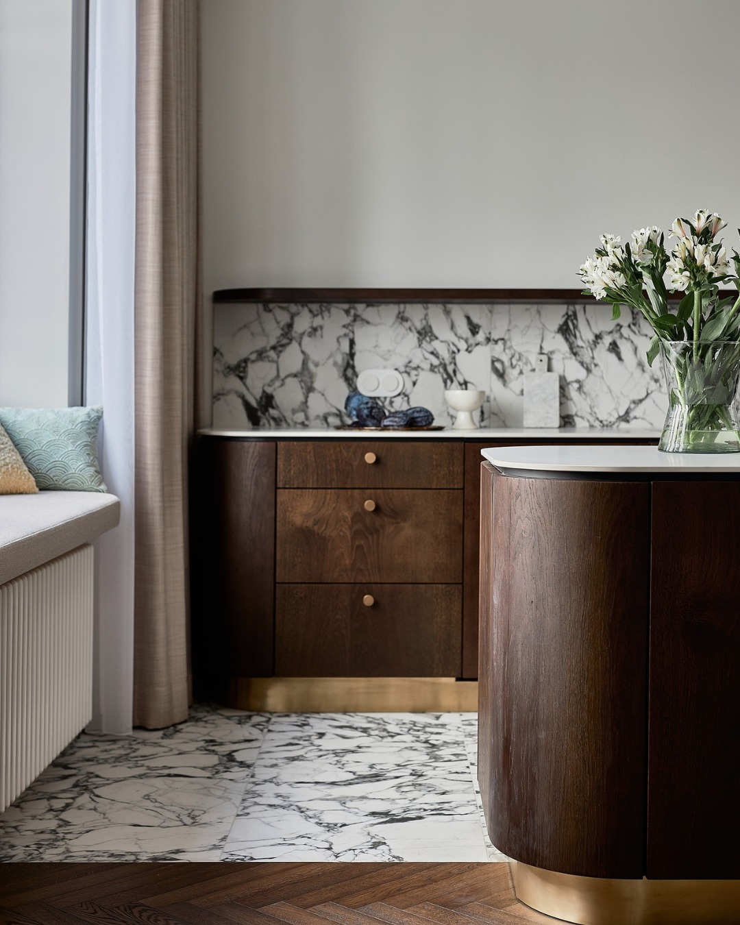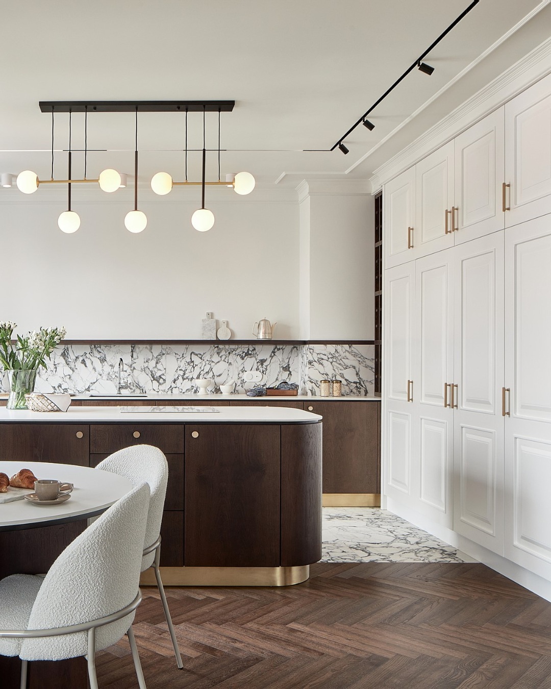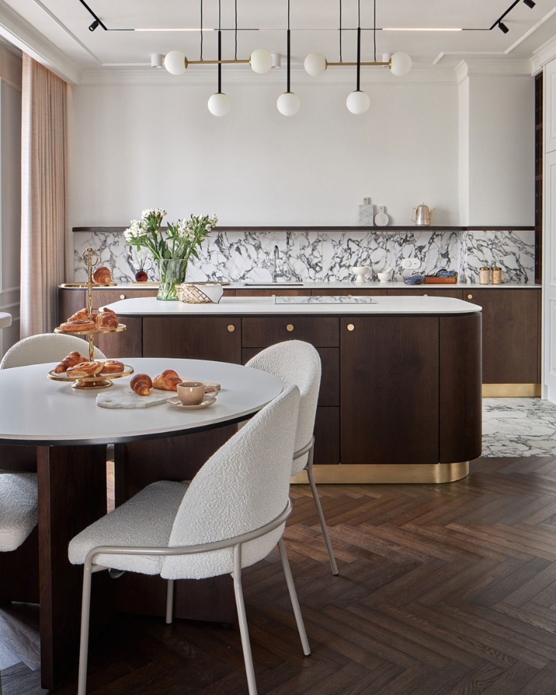 Nasza realizacja pokazuje, jak doskonale może prezentować się połączenie płytki inspirowanej marmurem z drewnianą podłogą Gajewski ułożoną w klasyczną jodełkę. W strefie kuchennej płytka zapewnia pełną funkcjonalność i łatwość utrzymania czystości, natomiast drewno wprowadza naturalne ciepło i elegancję, które nadają wnętrzu spójny charakter. To rozwiązanie idealne dla osób, które cenią styl i praktyczność w codziennym użytkowaniu.