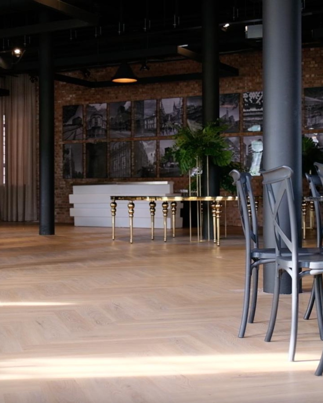 Wnętrze restauracji Stare Kino w Łodzi zyskało wyjątkowy klimat dzięki podłodze winylowej w jodełkę. W realizacji wykorzystano panele winylowe Solen 3 frimy MultiContract. Ciepły, naturalny odcień paneli oraz klasyczny układ jodełki tworzą przestrzeń, która sprzyja spotkaniom, rozmowom i spokojnej atmosferze. Połączenie ponadczasowej estetyki drewna z nowoczesną formą paneli idealnie wpisuje się w charakter miejsca.