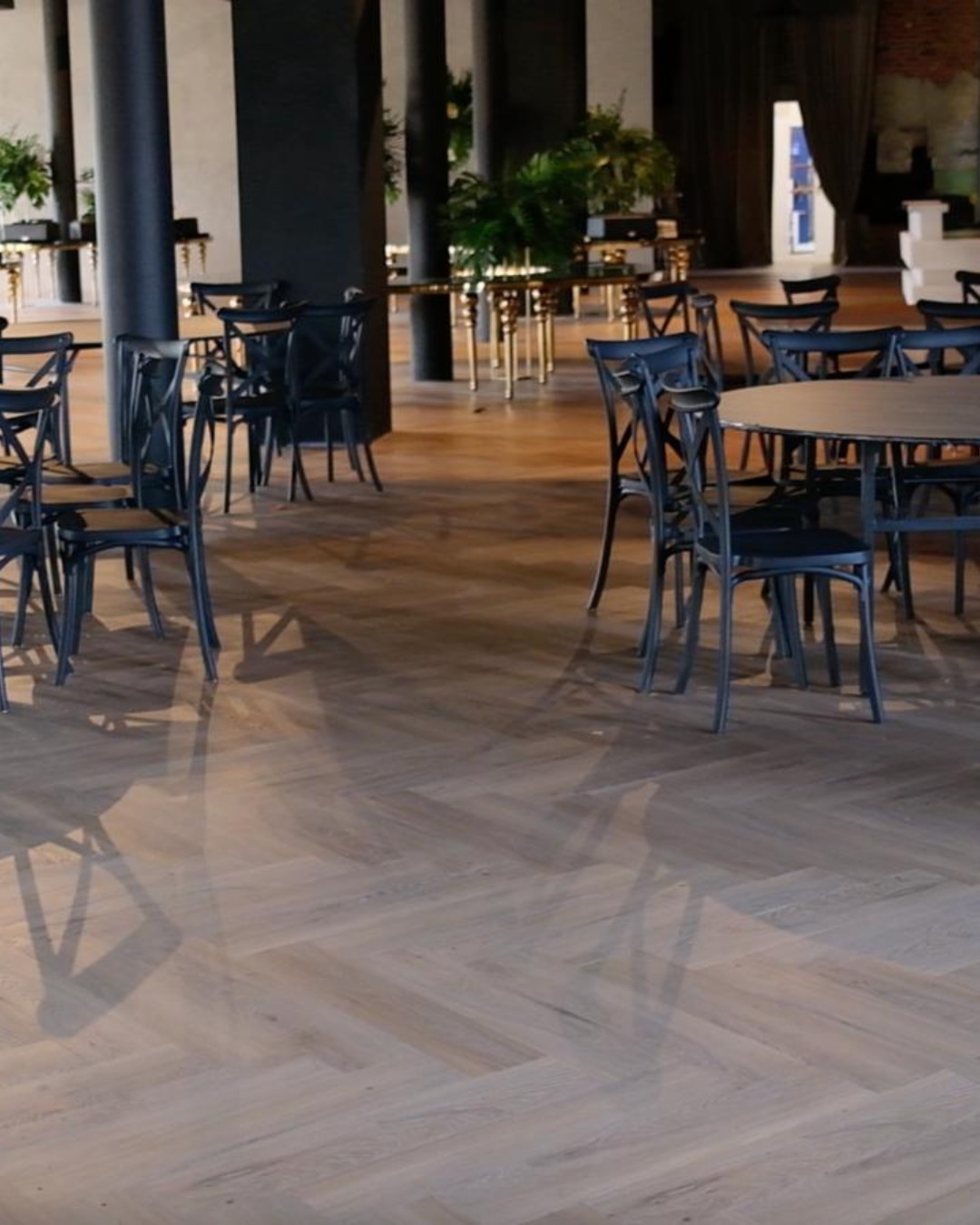 Drewniany deseń w układzie jodełki nadaje wnętrzu elegancji i szlachetności, a jednocześnie zachowuje lekkość i nowoczesny charakter. Panele winylowe z kolekcji Solen są odporne na intensywne użytkowanie, wilgoć i codzienne obciążenia — dzięki temu świetnie sprawdzają się w lokalach gastronomicznych, biurach oraz domowych wnętrzach.