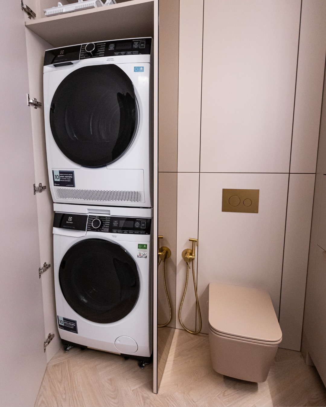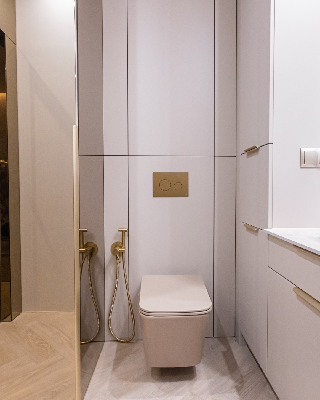 W tej realizacji postawiliśmy na panele winylowe w łazience, które doskonale sprawdzają się w pomieszczeniach narażonych na wilgoć. Podłoga winylowa łączy pełną wodoodporność z wysoką trwałością i komfortem użytkowania.