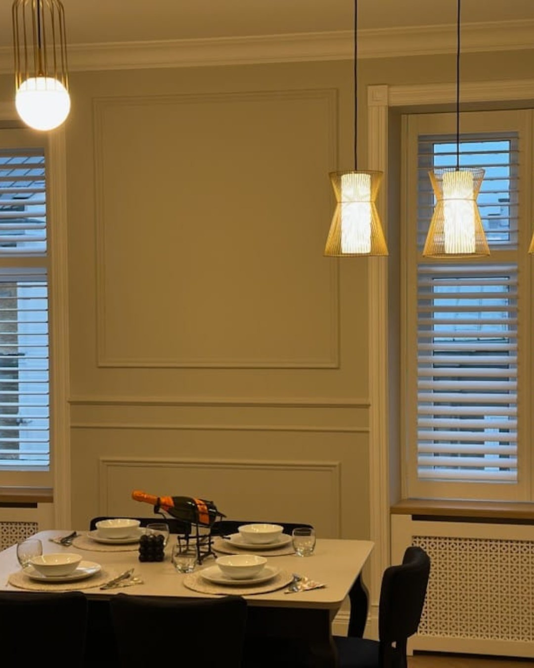 Białe shuttersy doskonale komponują się ze sztukateriami oraz stonowaną kolorystyką wnętrza, tworząc spójną całość. To rozwiązanie, które łączy historyczny charakter budynkuz nowoczesną funkcjonalnością i wysokim komfortem użytkowania.