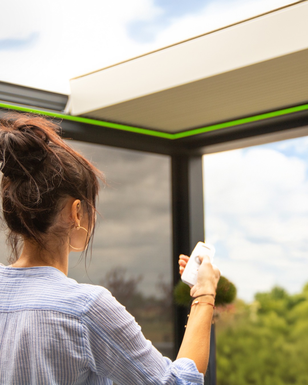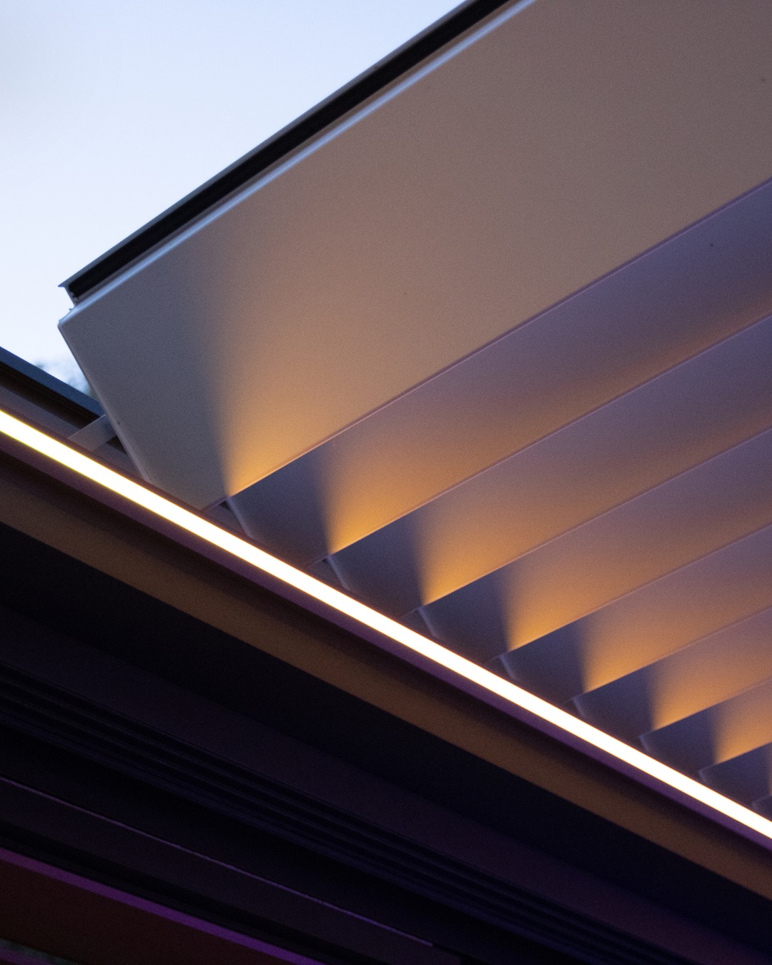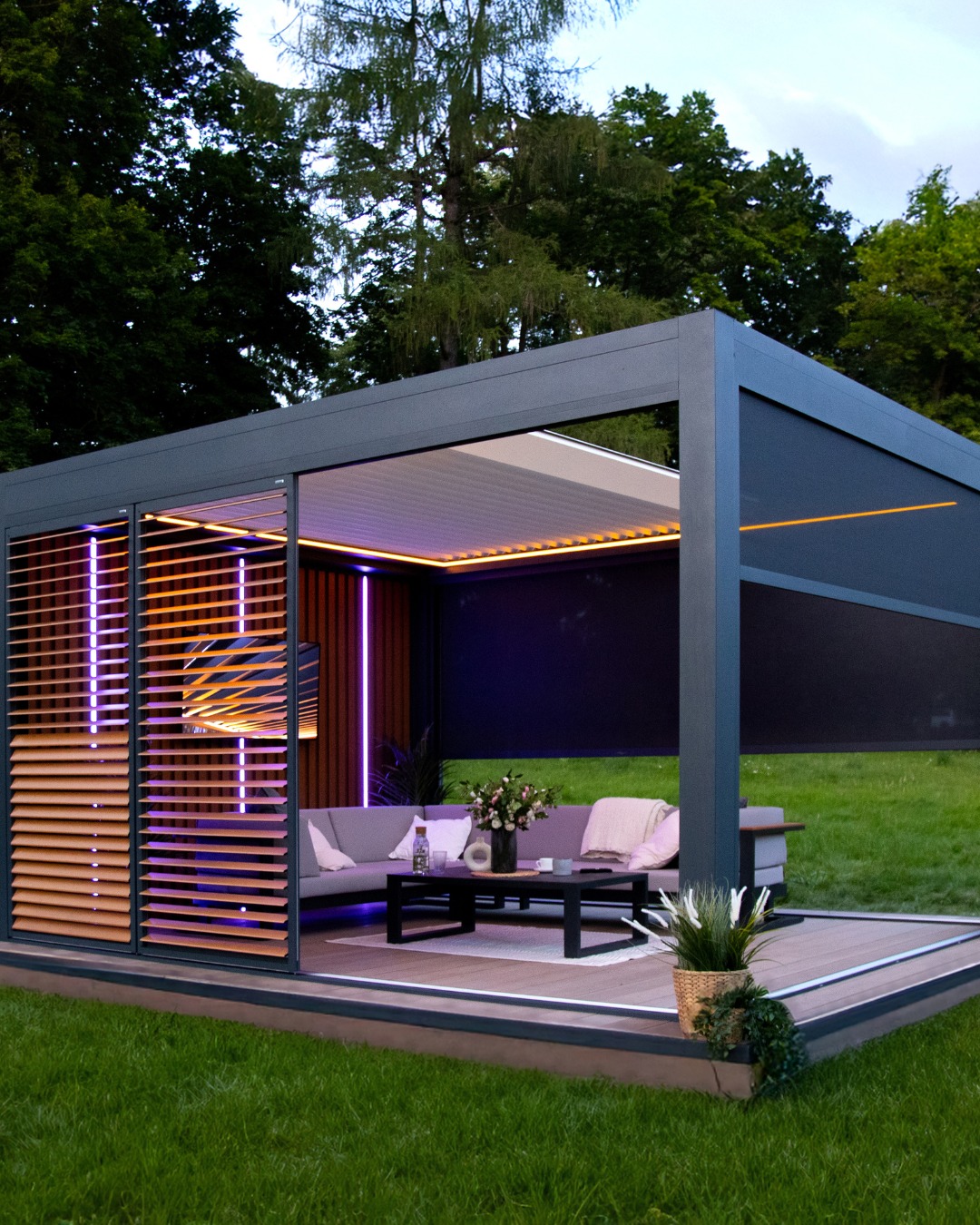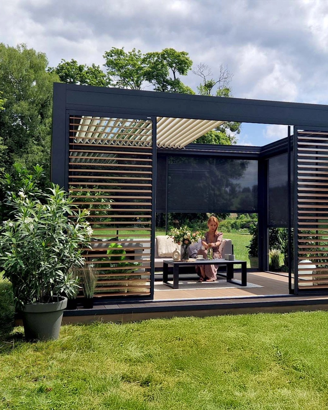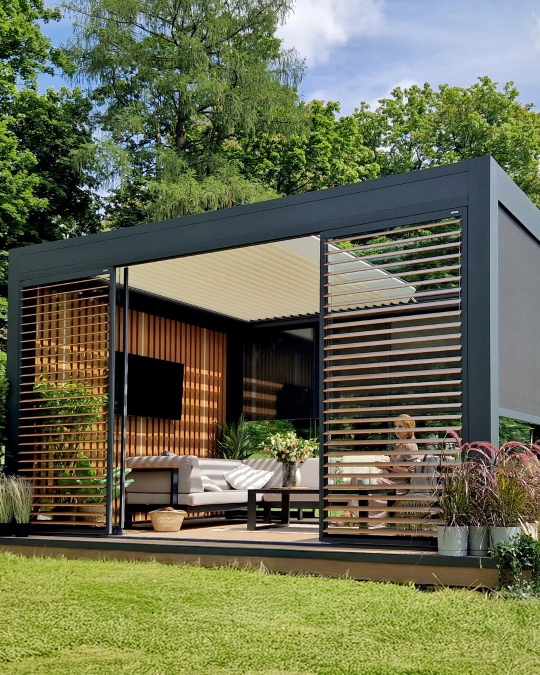 W tej realizacji zastosowaliśmy Tarasola Technic View – innowacyjne bioklimatyczne zadaszenie z dachem lamelowym. Dzięki zaawansowanej technologii lamele przesuwają się płynnie od pozycji poziomej do pionowej, umożliwiając pełną kontrolę nad ilością światła i cieniem na tarasie. Dach można całkowicie otworzyć, zamknąć lub zatrzymać w dowolnym momencie, a po zsunięciu lamele zajmują zaledwie 25% powierzchni całej konstrukcji. To rozwiązanie łączy nowoczesny design, komfort użytkowania i niezawodną ochronę w każdych warunkach pogodowych.